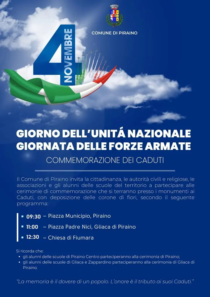 🇮🇹 4 Novembre – Giornata dell’Unità Nazionale e delle Forze Armate 📌 Oggi abbiamo celebrato la Commemorazione dei Caduti, un momento di profondo significato per la nostra comunità. Le cerimonie si sono svolte presso i monumenti ai Caduti di Piraino, Gliaca e Fiumara, con la deposizione delle corone